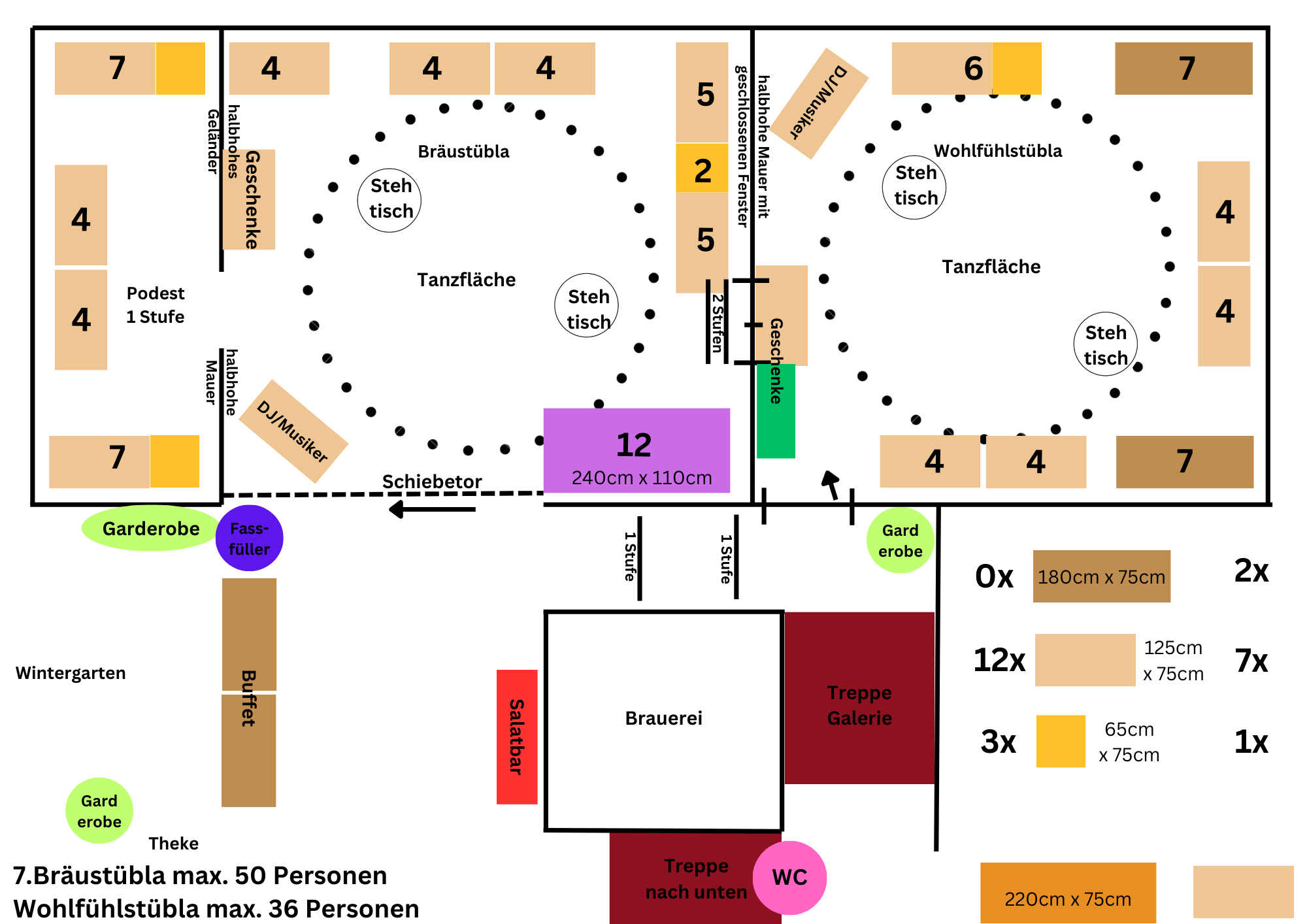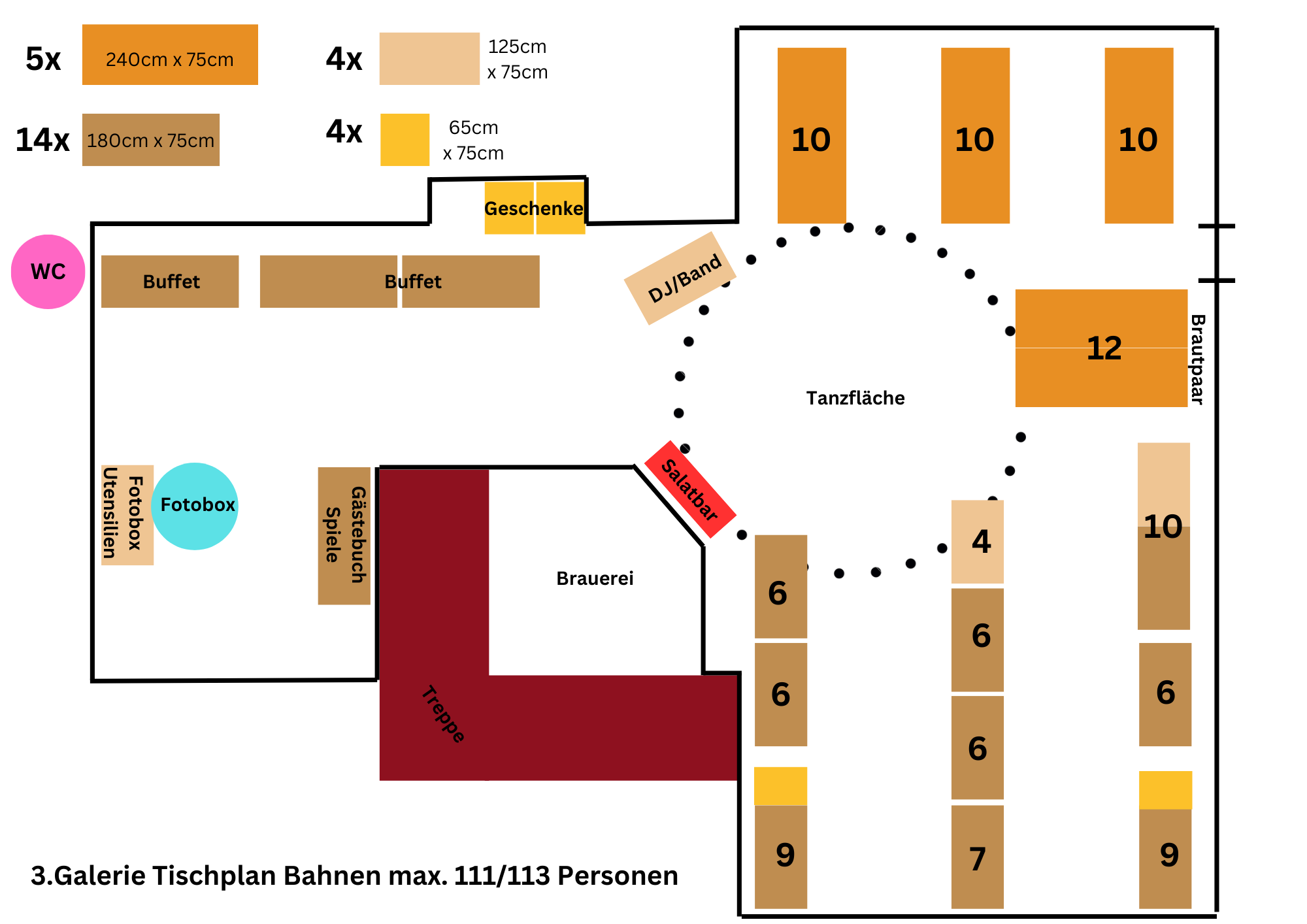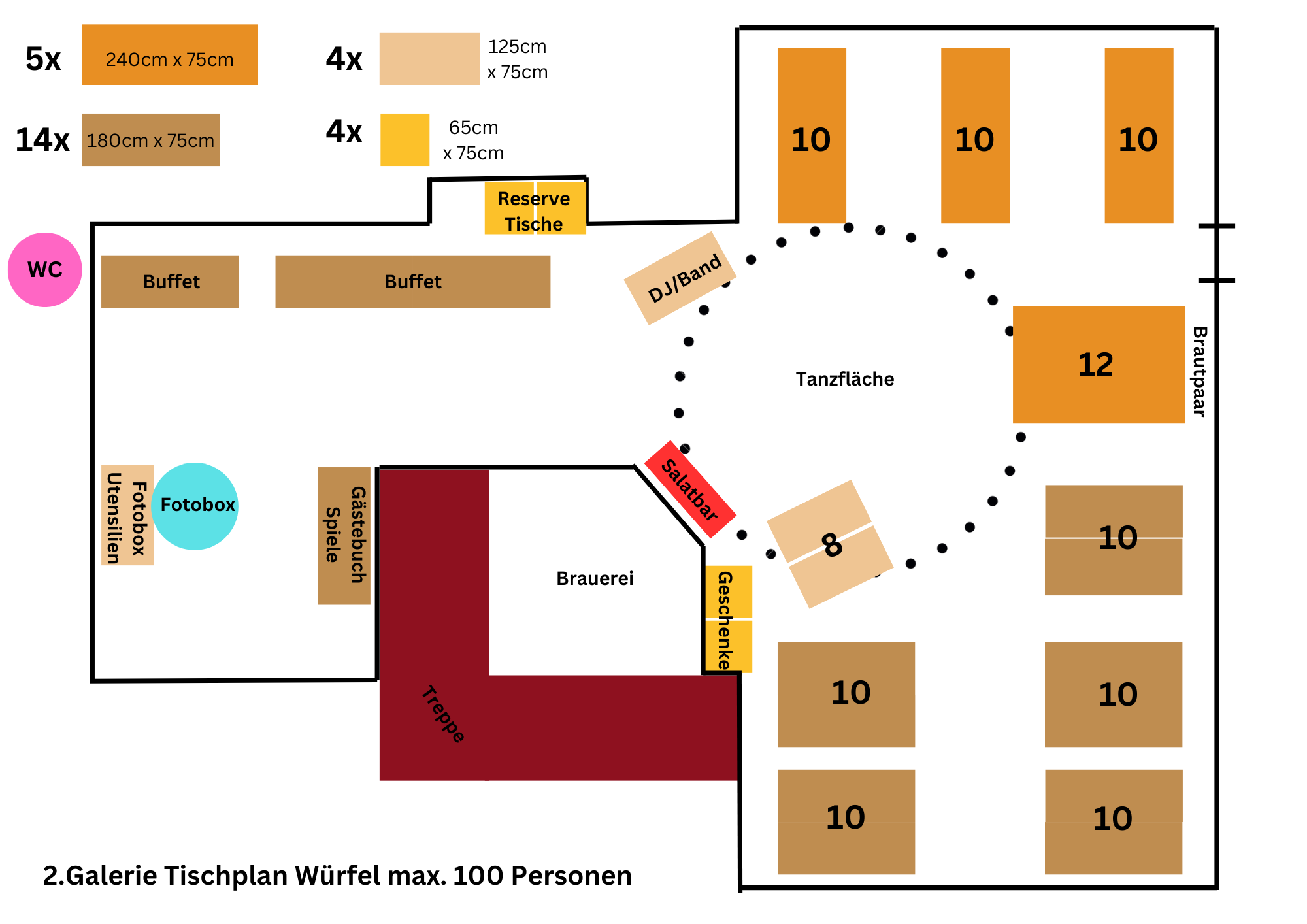 Hier ein paar Vorschläge, wie wir bei Eurer Feier die Tische optimal nach Personenzahl und Bedarf stellen können.