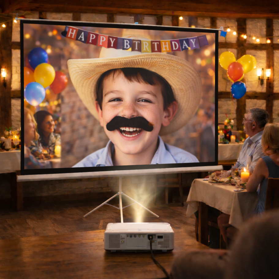 🖼 Große freistehende Leinwand (205 × 250 cm) – gut sichtbar für alle Gäste